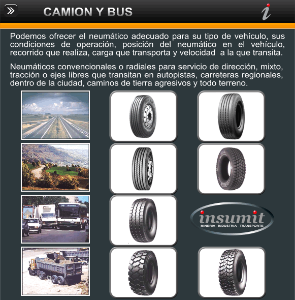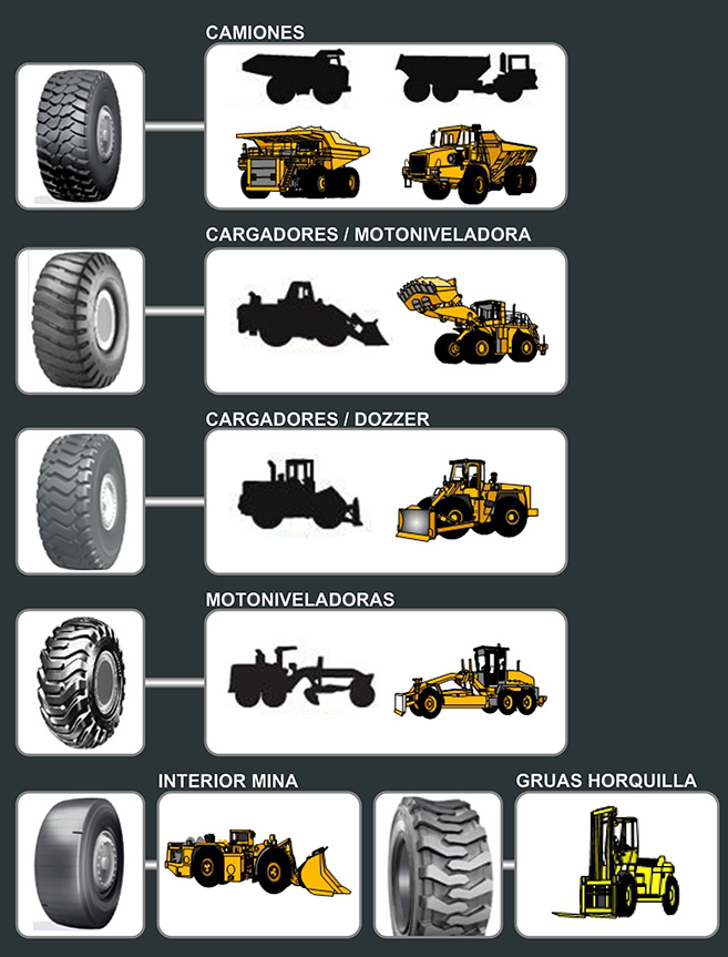 Neumáticos para: camiones fuera de carretera, cargadores, wheel dozzer, retroexcavadoras, moto niveladora, grúas horquillas, mini cargadores, equipos de puerto, e industriales. Neumáticos para faenas de rajo abierto como subterráneas.